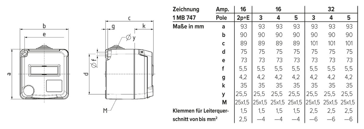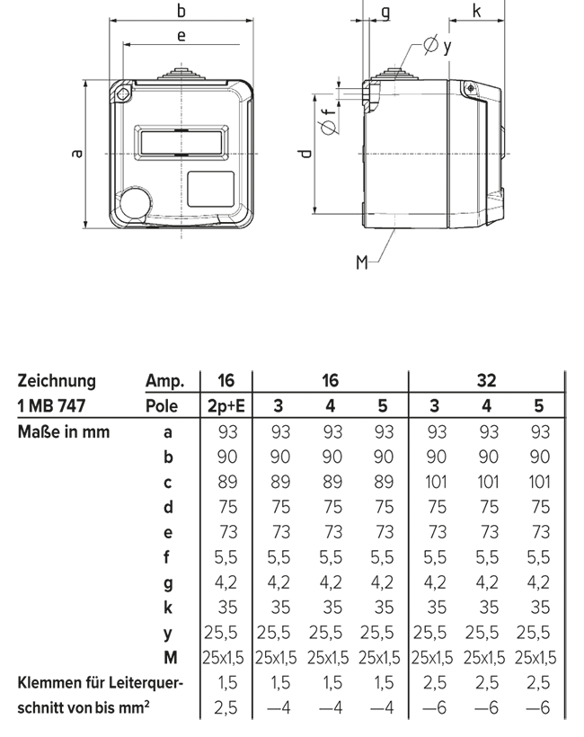 Leitungseinführungen: 1 x M 25 mit Einführungsstutzen oben, 1 x M 25 zum Ausschneiden unten, 1 x M 20 zum Ausschneiden auf der Rückseite, für Kabel 7 bis 13 mm Ø