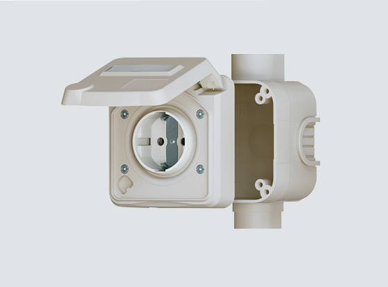 Der grosse Verdrahtungsraum bietet Plartz für Zuleitungen bis 6 mm². Das Unterteil ist um 180° drehbar, somit ist die Leitungseinführung von unten ohne zusätzliche Arbeit möglich. Schutzart IP54 (fremdkörper- und spritzwassergeschützt) macht die Aufputzsteckdosen sicher für vielfältige Einsatzgebiete. Zusätzliche Membranen sind im Gehäuse verfügbar.