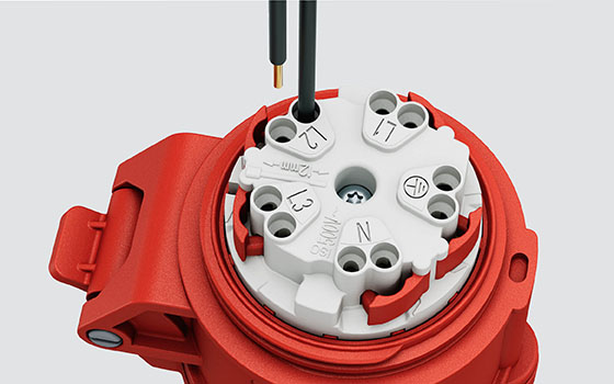 Bei den Modellen in 63 und 125 A sind die Kontaktschrauben platzsparend neben dem Führungskragen in das Vorderteil des Steckers, der Kupplung oder der Steckdose integriert.